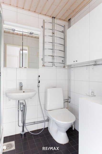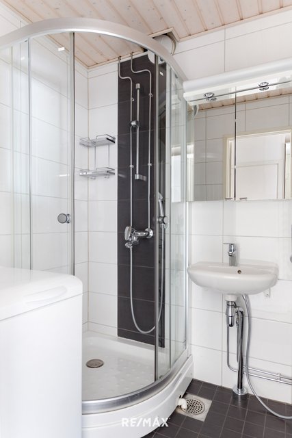 - WC-istuin, suihkukaappi, pesukoneliitäntä, lattialämmitys, pesuallas, ja bidee-suihku