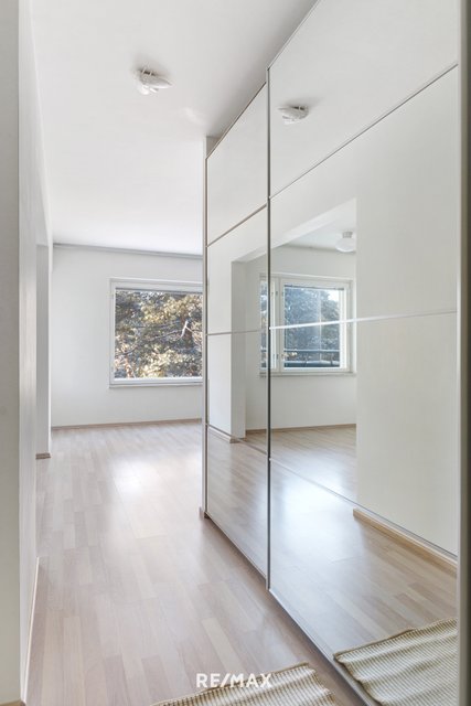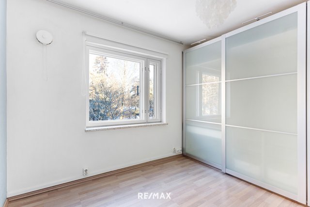 - Makuuhuone sijoittuu omaan rauhaansa. Kulku sinne on eteisestä. Seinänaapureita ei ole ja ikkunat ovat fiksusti pohjoisen ouolelle. Yksi seinä on kokonaan siistiä liukuovellista kaappitilaa.