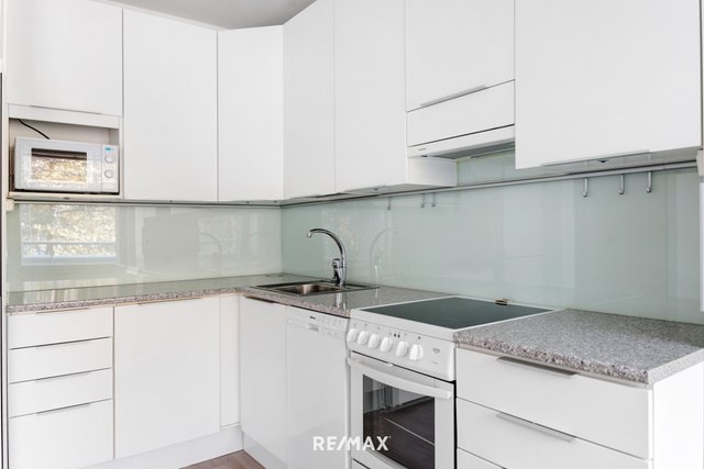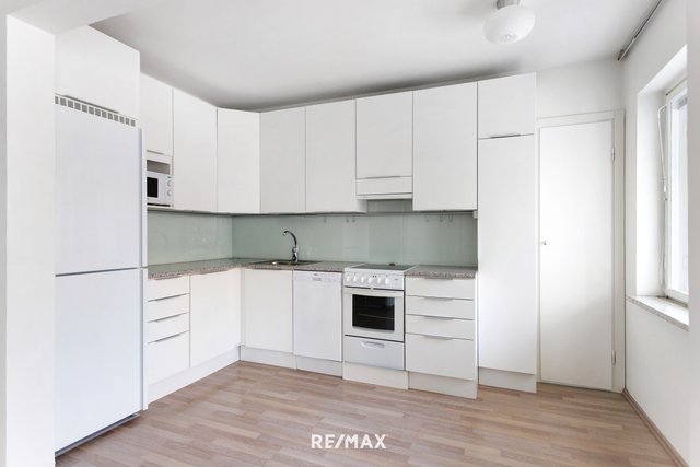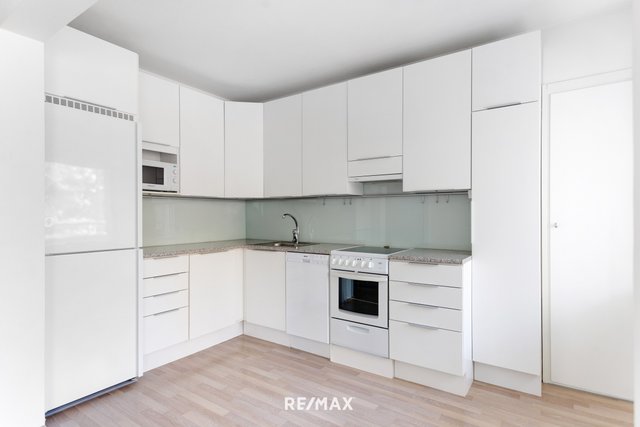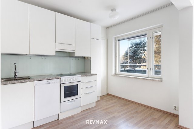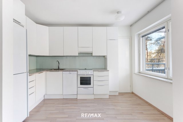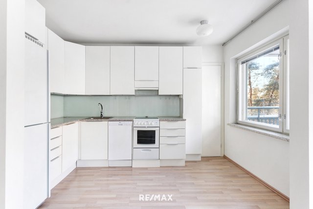 - Keittiö on avara ja valoisa ja se aukeaa sujuvasti olohuoneeseen. Kaappitilaa on runsaasti ja keittiöön mahtuu myös ruokapöytä.