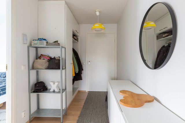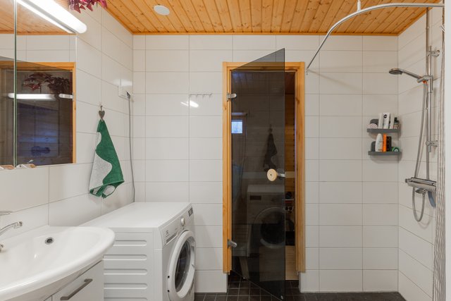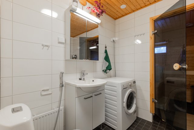 - WC-istuin, suihku, pesukoneliitäntä, lattialämmitys, peilikaappi, pesuallas, allaskaappi, ja bidee-suihku