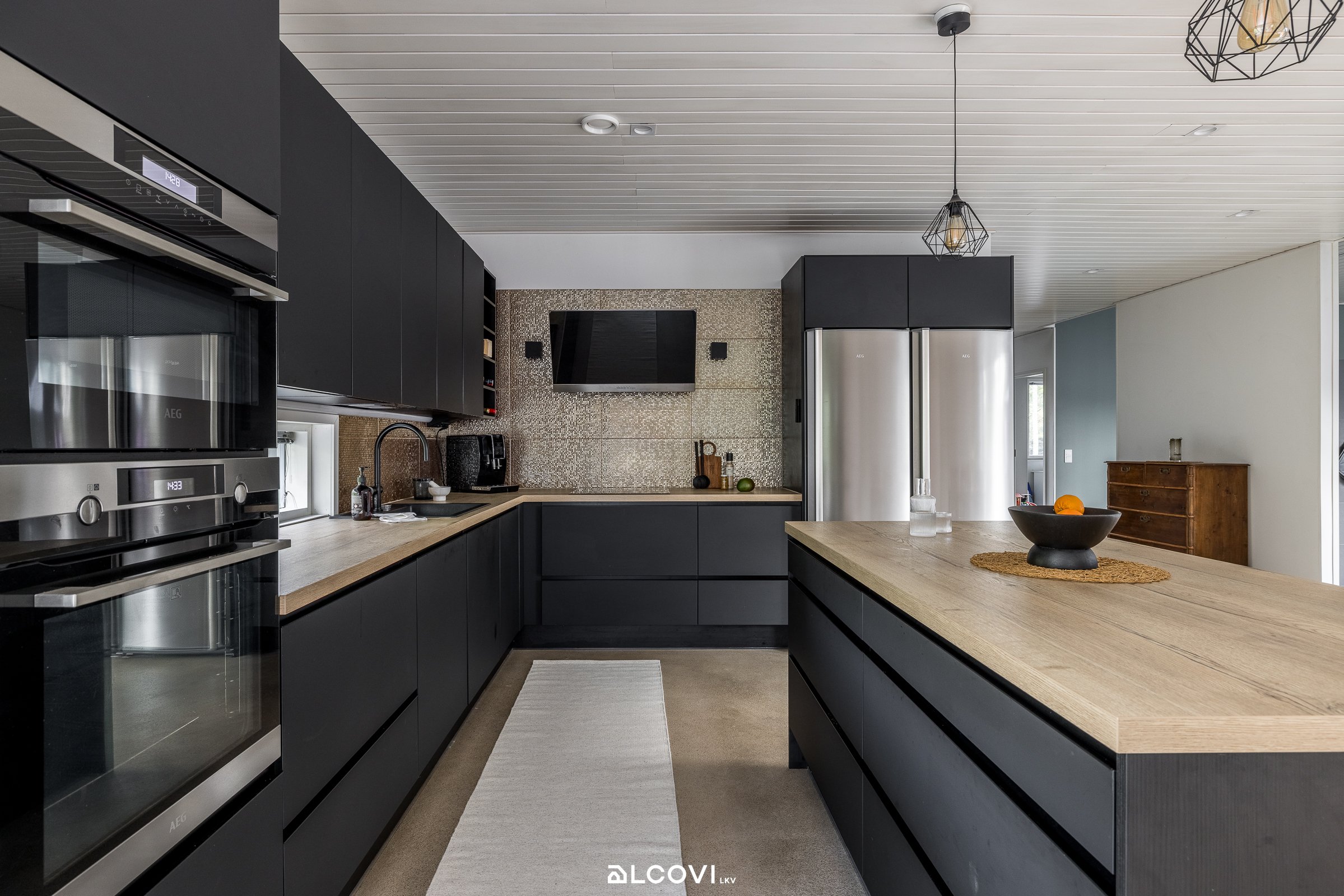 Keittiö on kotimainen Puustellin kokonaisuus, jossa työskentely- ja säilytystilat ovat erinomaiset. Laadukkaat kodinkoneet ja moderni ilme yhdistyvät rouheaan betonilattiaan ja suurista maisemaikkunoista avautuvaan vehreään maisemaan. Olohuoneessa tunnelmaa luo takka (vesikierto), ja tilojen monikäyttöisyys näkyy erityisesti makuuhuoneiden väljyytenä sekä muunneltavuutena. Tilava kylpyhuone saunoineen on kaunis kokonaisuus, jossa maanläheiset sävyt ihastuttavat! Vesipisteellä sekä runsain kaappitiloin varusteltu kodinhoitohuone sujuvoittaa arjen pyykkihuoltoa, ja suuri vaatehuone viimeistelee säilytystilat.