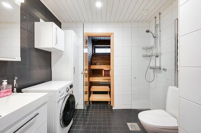 - WC-istuin, suihkuseinä, pesukoneliitäntä, bidee-suihku, suihku, allaskaappi, ja peilikaappi