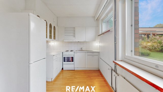 - Vaaleasävyinen erilliskeittiö tarjoaa toimivat puitteet arjen ruoanlaittoon. Varusteluun kuuluvat liesi, liesituuletin, lavuaari sekä jääkaappipakastin. Astianpesukoneelle on varattu oma tilansa, ja keittiöön mahtuu myös pieni ruokailuryhmä. Pintamateriaalit ovat käytännölliset: lattia on laminaattia, välitila laatoitettu ja seinät maalattu.