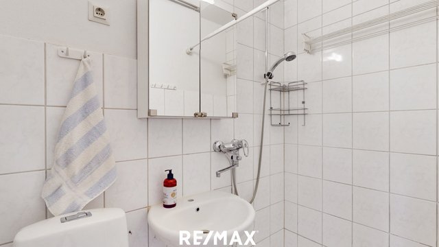- Kylpyhuoneessa on kaikki perusmukavuudet arjen tarpeisiin. Varusteluun kuuluvat suihku, lavuaari, peilikaappi sekä wc-istuin. Lattia on laatoitettu, ja seinäpinnat osin laatoitetut ja osin maalatut.