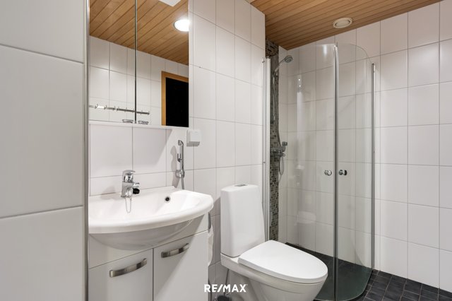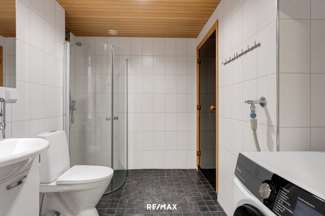 - WC-istuin, suihku, suihkuseinä, lattialämmitys, peilikaappi, pesuallas, allaskaappi, bidee-suihku, pesukoneliitäntä, ja pesukone