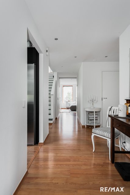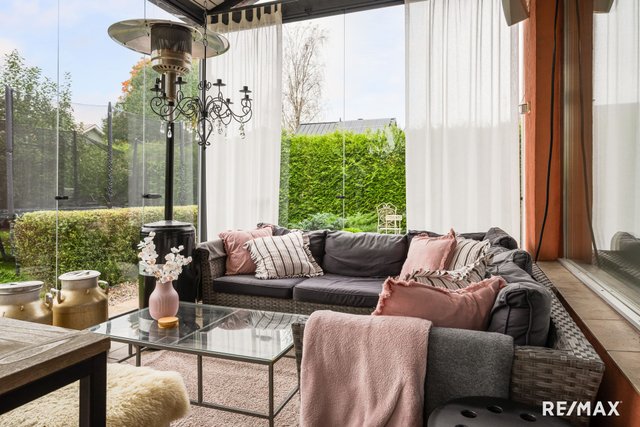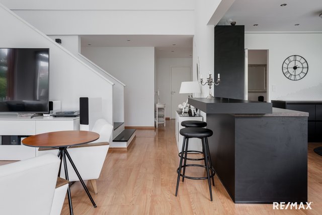 - Tämä koti avautuu eteesi valoisana ja kutsuvana. Olohuone on heti sisään astuessa korkeaa, avointa tilaa, joka luo väljyyden ja rauhan tunteen. Olohuoneesta on täydellinen näkyvyys ruokailutilaan, mikä tekee tilasta sosiaalisen ja joustavan arjen tarpeisiin. Sen lisäksi tila avautuu kauniisti suoraan pihalle ja lasitetulle terassille, tuoden luonnonvalon ja ulkotilat osaksi sisustusta. Kauniit portaat yläkertaan toimivat tilassa tyylikkäänä katseenvangitsijana. Tämä on tila, joka todella hengittää.