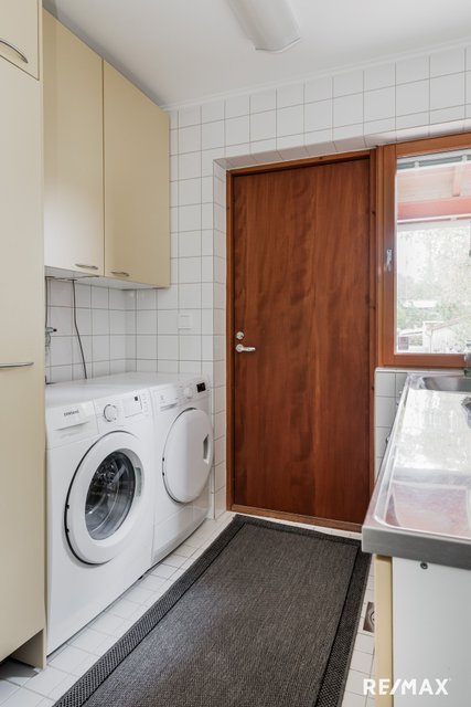 - Alakerrasta löydät käytännöllisen kodinhoitohuoneen, joka helpottaa arkea. Sieltä on myös kätevä suora käynti takapihalle, mikä on täydellistä esimerkiksi lakanapyykkien viemiseen narulle kuivumaan.