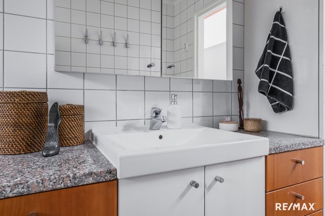 Kodinhoitohuone on sijoitettu käytännöllisesti alakertaan ja sieltä on suora käynti takapihalle (esim. pyykeille). Alakerrassa erillinen WC vieraille ja yläkerrassa toinen kylpyhuone/WC.