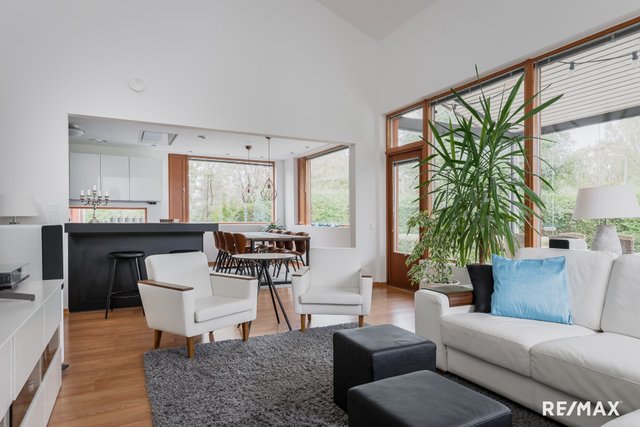 Tämä koti on tehty suurille unelmille ja perhe-elämän vaivattomuudelle. Astut sisään tilaan, joka todella hengittää ja tuntuu hyvältä. Olohuone on korkeaa, avointa tilaa, jossa valo virtaa esteettä sisään ja tila avautuu suoraan pihalle ja lasitetulle terassille.