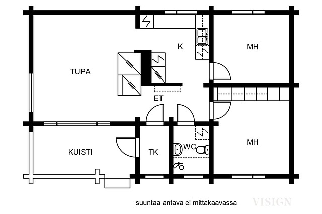 - Pinta-alatiedot on saatu rakennuspiirustuksista. Edellä mainittu pinta-ala saattaa tämän ikäisessä kohteessa poiketa olennaisestikin asuinrakennusten nykyisten mittaustapojen ja standardien mukaan laskettavasta asuintilojen pinta- alasta. Asuinrakennuksen todellinen asuinpinta-ala voi siis olla esitteessä mainittua pienempi tai suurempi.