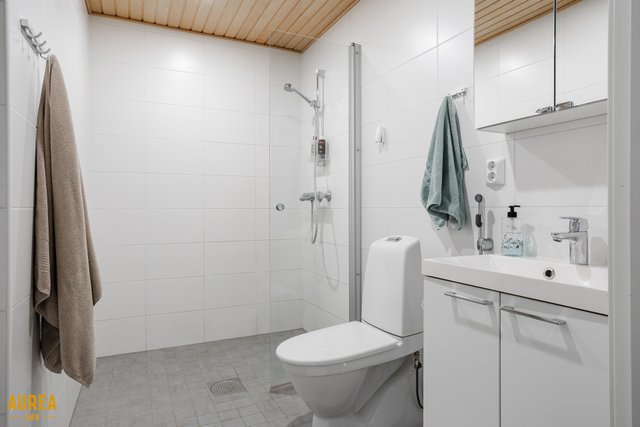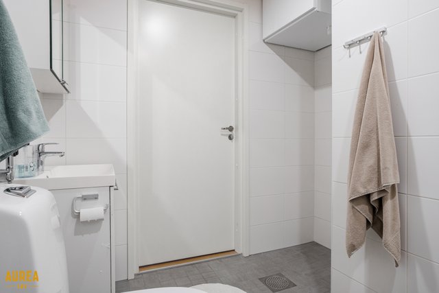 - Moderni ja käytännöllinen kylpyhuone, jossa helppohoitoiset ja ajattomat pinnat. Kylpyhuoneessa suihku, wc-tilat ja pesukoneliitäntä.