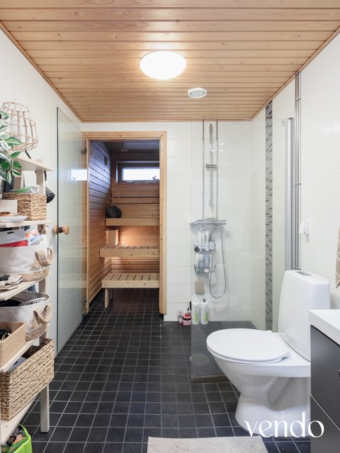 - WC-istuin, suihku, peilikaappi, lattialämmitys, pesuallas, allaskaappi, bidee-suihku, pesukoneliitäntä, ja suihkuseinä
