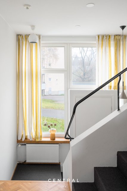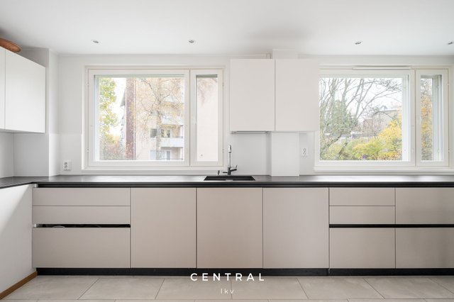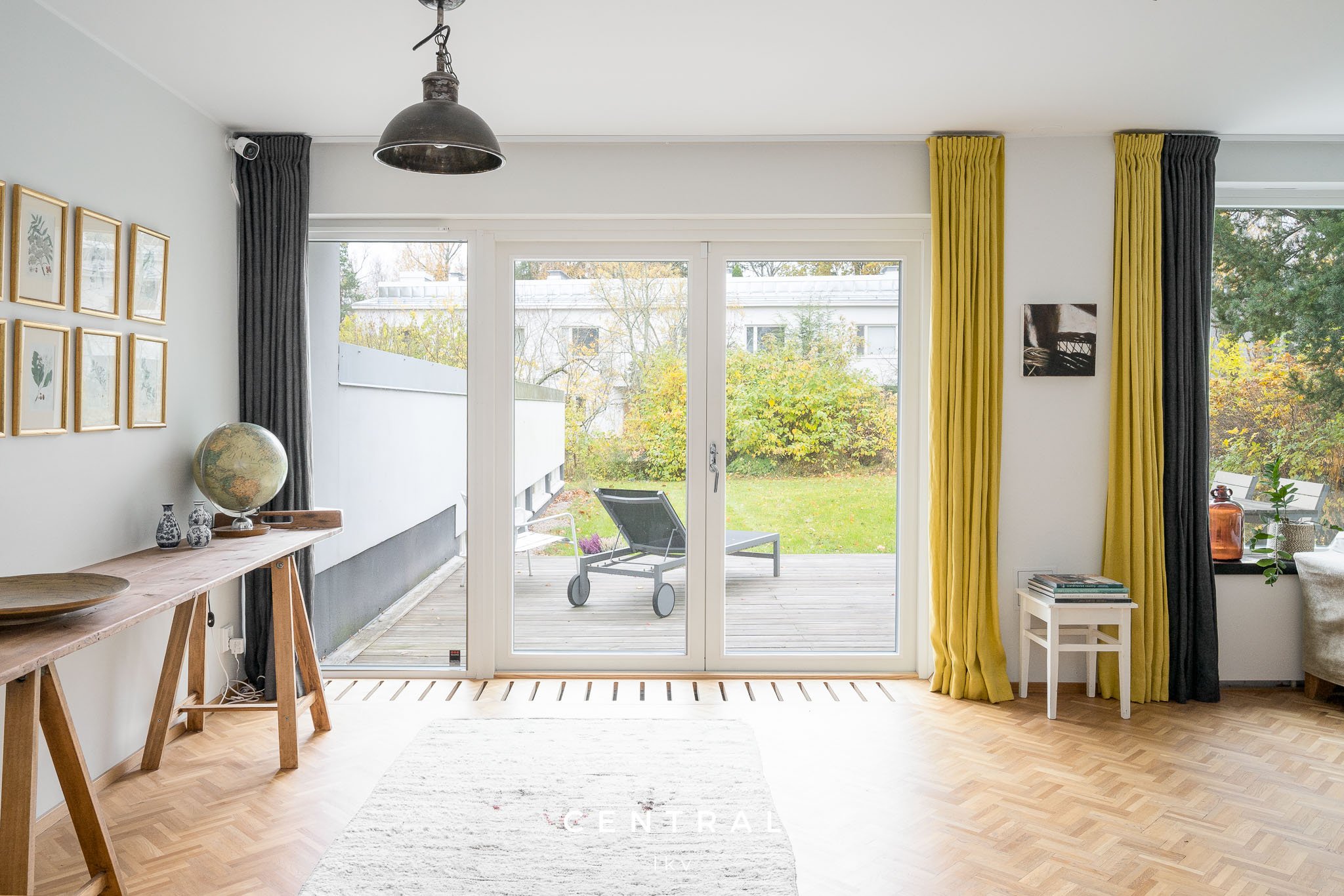 - Avara ja valoisa olohuone, jossa isot ikkunapinnat omalle suojaisalle ja vehreälle sisäpihalle, jossa myös terassi.