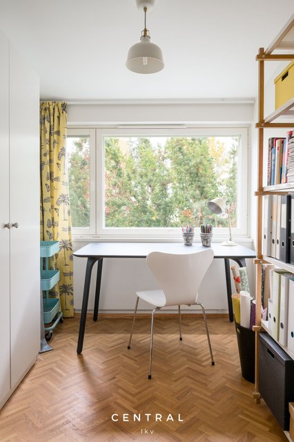 - Makuuhuoneita on tällä hetkellä käytössä kolme, mutta pohjakerroksen askartelutila on myös toiminut makuuhuoneena. Yläkerrassa on myös arkiolohuone, johon saa helposti väliseinän rakennettua ja siitä näin ollen peräti viidennen makuuhuoneen.
