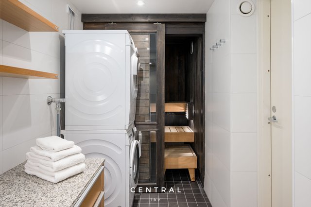 - WC-istuin, suihku, allaskaappi, lattialämmitys (Kellarikerroksessa), pesukoneliitäntä, peili, ja pesuallas