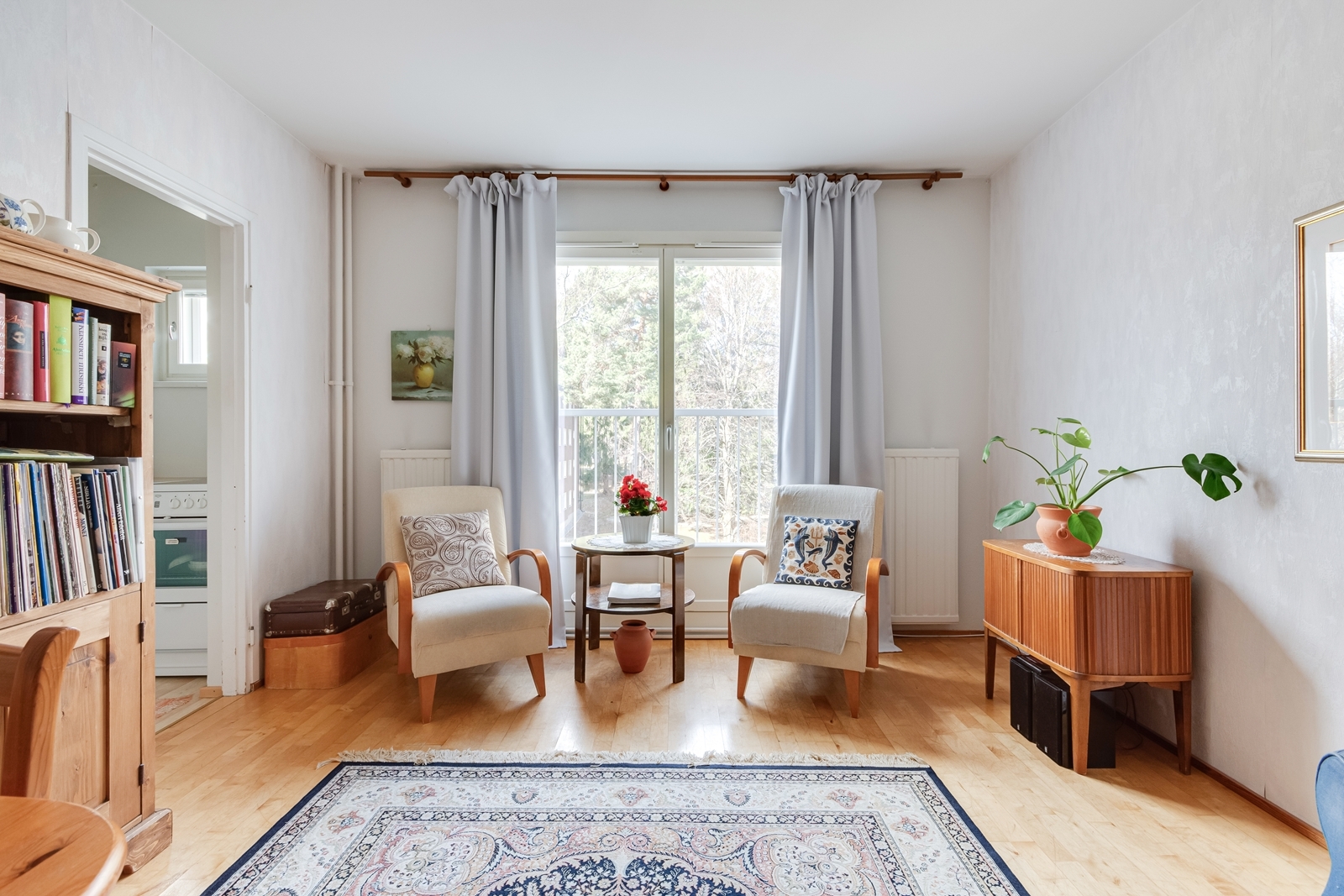 Oleskelutilan ranskalaiselta parvekkeelta avautuu avoimet, kauniit näkymät yhtiön pihapiiriin – täydellinen paikka nauttia aamukahvista ja linnunlaulusta. Makuualkovi mahdollistaa luontevan paikan sängyn sijoitukseen. Ikkunallinen keittokomero tuo tilaan valoa ja kylpyhuoneessa on kaikki tarpeellinen arjen mukavuuteen. Säilytystilaa tilavassa vaatehuoneessa.