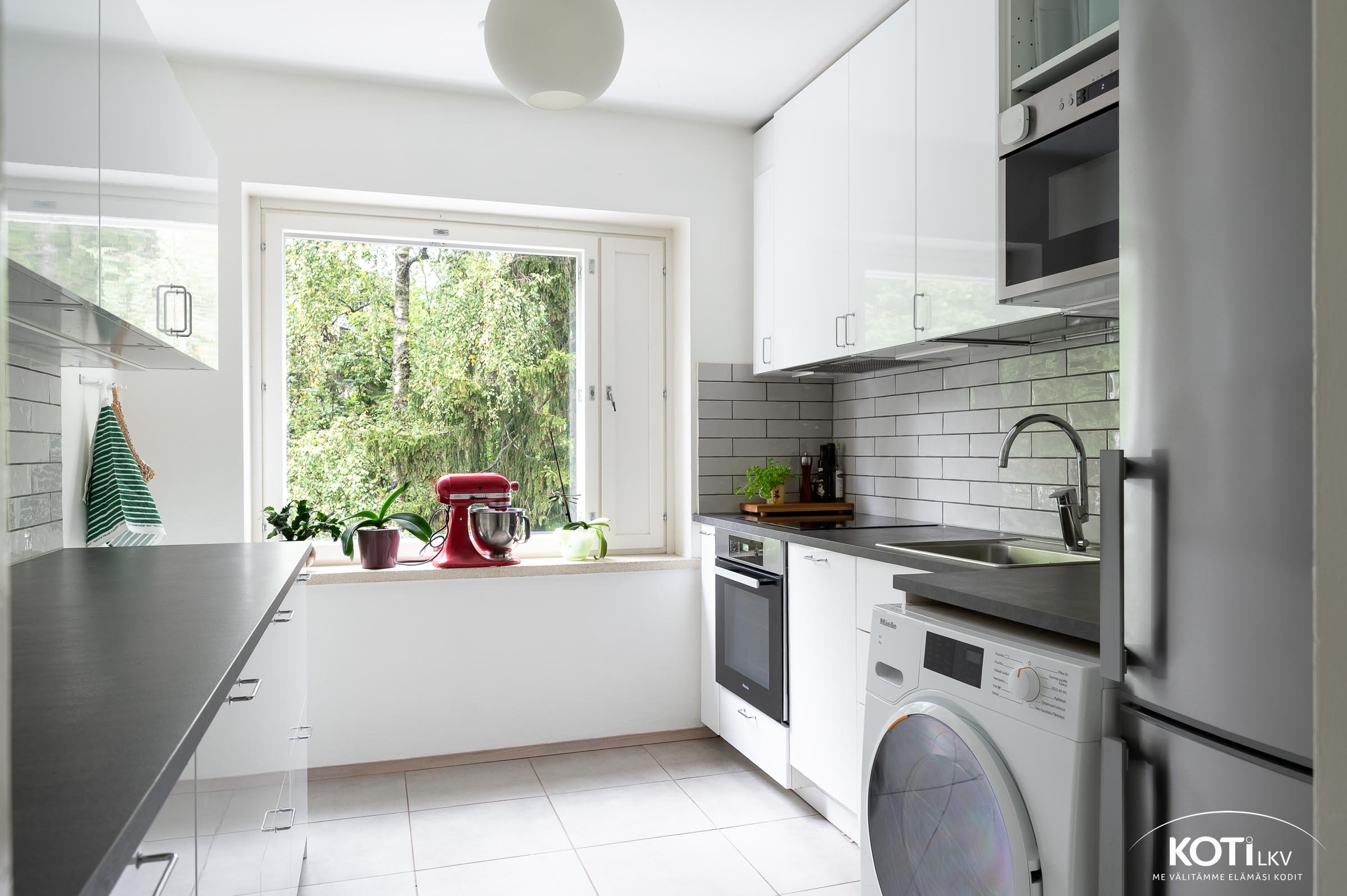 - Maalatut seinät ja laattalattia, kaakeloitu välitila ja tasot laminaattia, vaaleat kaapistot. Erillisuuni ja induktioliesitaso, liesituuletin, integroitu astianpesukone ja mikroaaltouuni, jääkaappi / pakastinkaappi ja pyykkikone. Keittiö remontoitu 1/2021.