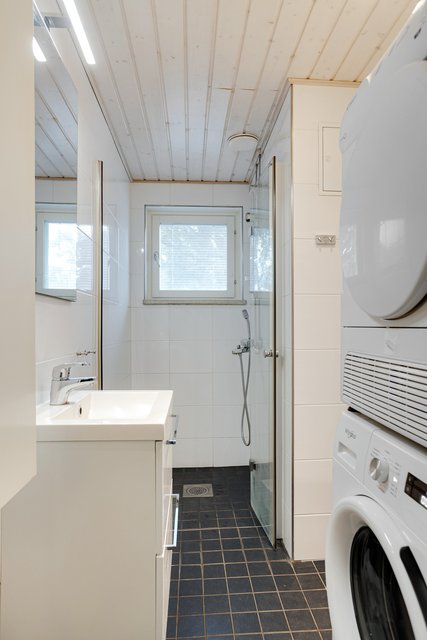 - Suihku, suihkuseinä, pesukoneliitäntä, lattialämmitys, peilikaappi, ja pesuallas
