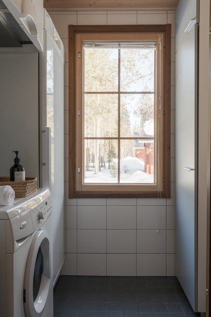 - Pesukoneliitäntä, pesukone, kuivauskaappi, lattiakaivo, ja lattialämmitys