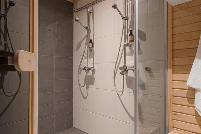 - Suihku, suihkuseinä, lattialämmitys, ja kiinteät valaisimet