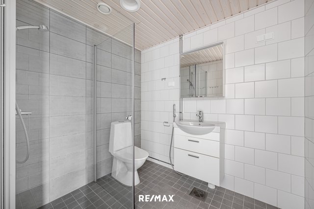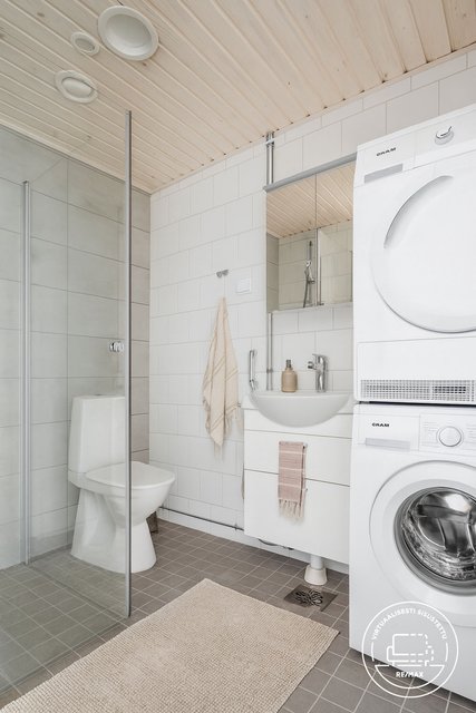 - WC-istuin, lattialämmitys, suihku, pesuallas, peilikaappi, allaskaappi, bidee-suihku, suihkuseinä, ja pesukoneliitäntä