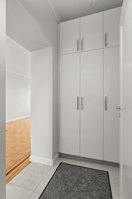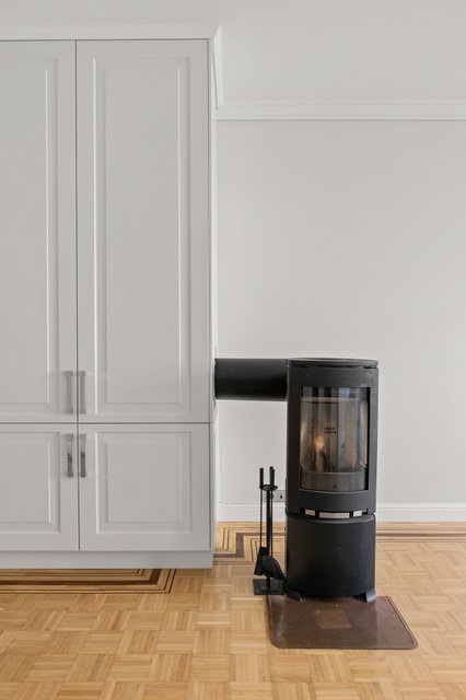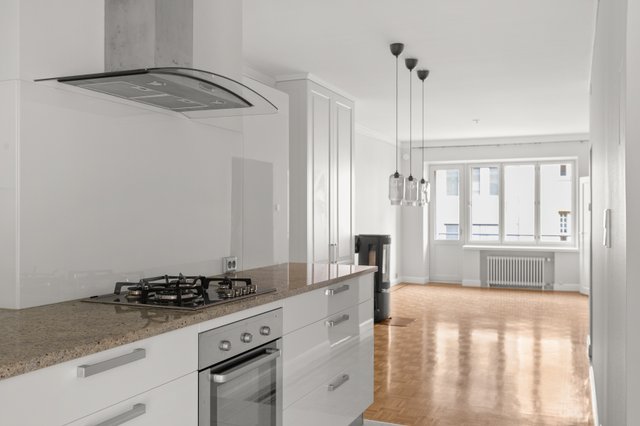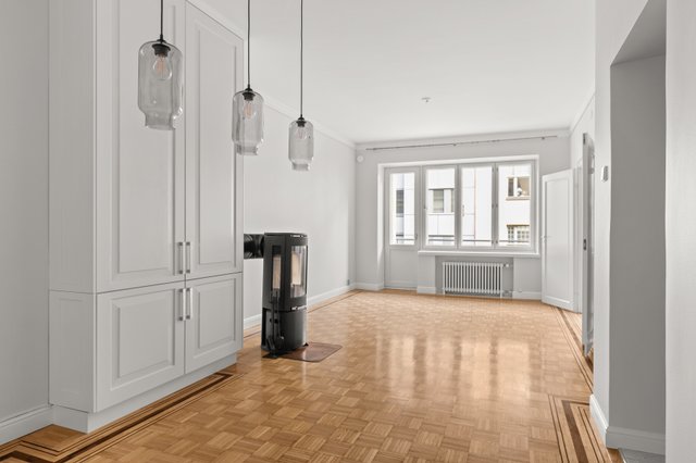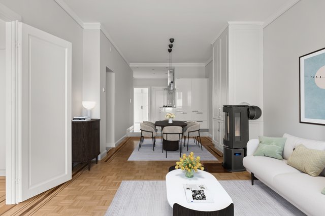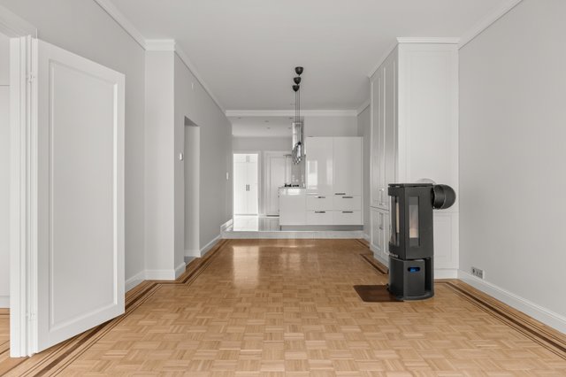 Korkeat huoneet ja avarat tilat luovat ilmavan ja kutsuvan tunnelman, ja olohuoneen takka tuo lämpöä ja kodikkuutta viileisiin iltoihin. Olohuoneesta on käynti etelään suuntautuvalle parvekkeelle, jolta avautuu näkymä kadulle. Keittiö on sekä tyylikäs että toimiva – laadukkaat kodinkoneet, kaasuliesi ja kivitasot tekevät ruoanlaitosta nautinnon.