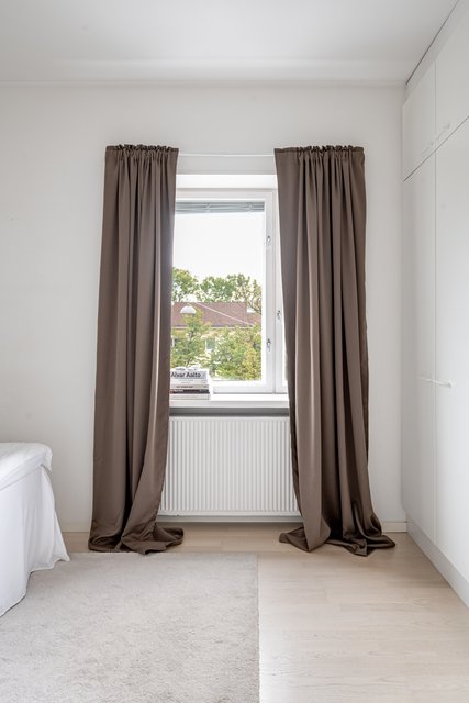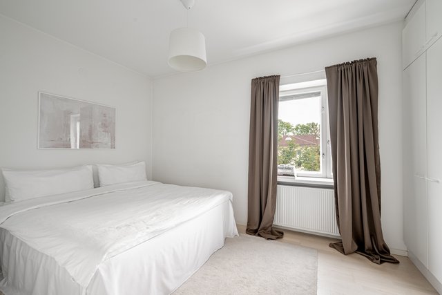- Tilava makuuhuone, jossa koko seinän leveydeltä kaapistoissa säilytystilaa.