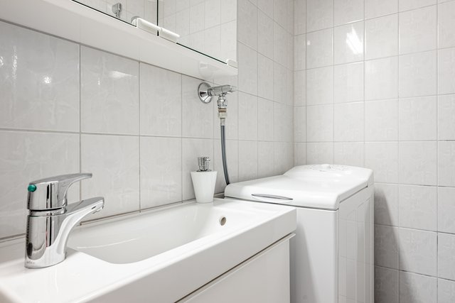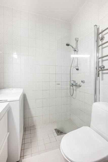 - Täyslaatoitettu kylpyhuone, jossa varusteluna: suihku, kääntyvä suihkuseinä, peilikaappi, allaskaappi, pesukoneliitäntä, rättipatteri, wc-istuin, seinät kaakelia ja laattalattia.