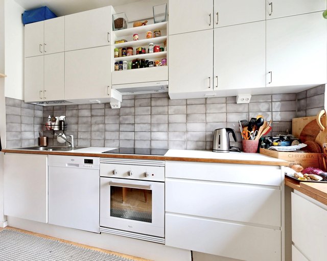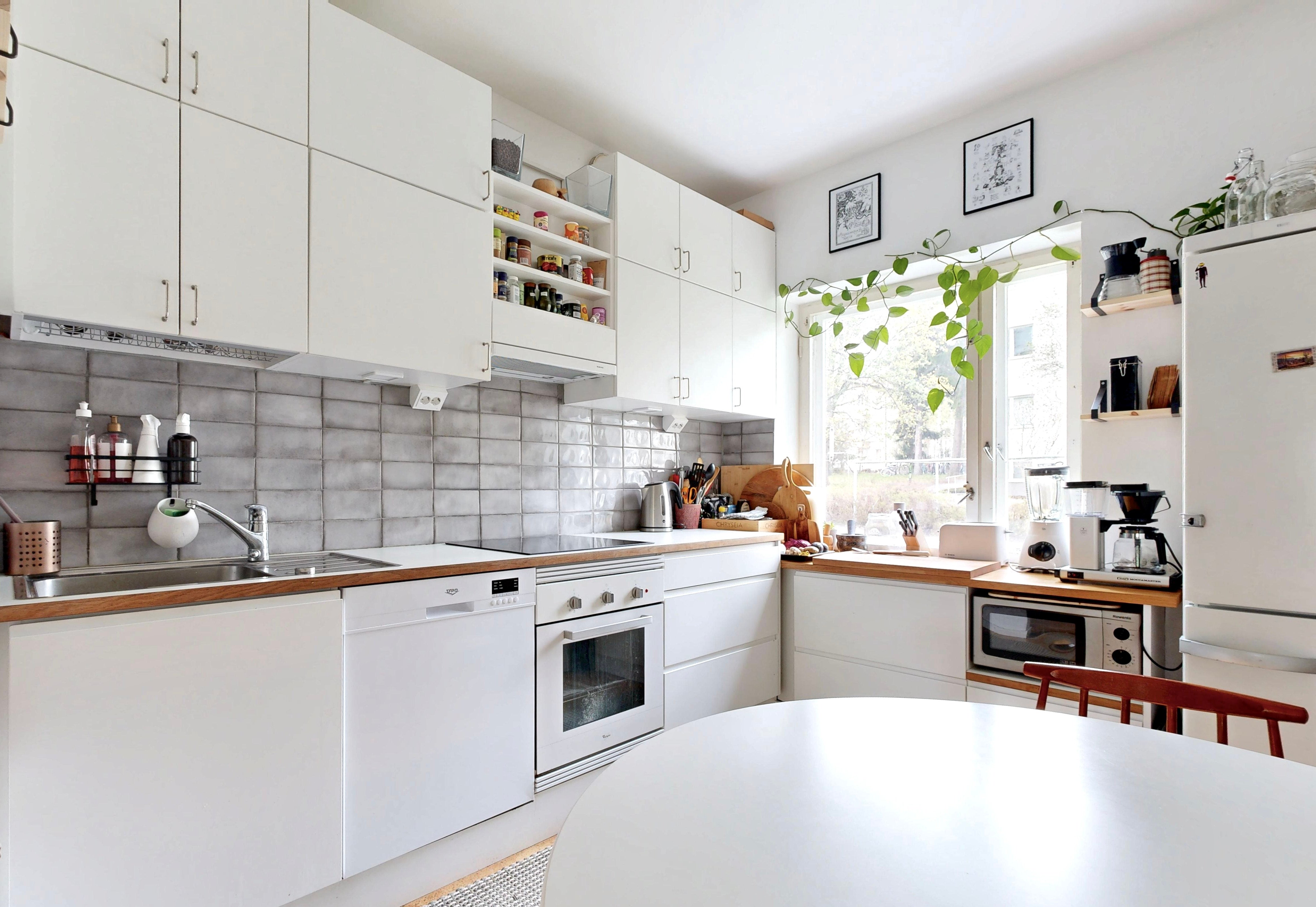 - VARUSTUS: Induktioliesi, Erillisuuni, Liesituuletin Jääkaappipakastin, Hana, Allas, Astianpesukone, Kaapistot, VÄLITILA: Kaakeli. Maalattu. TYÖTASO: Laminaatti. LATTIA: Korkki.