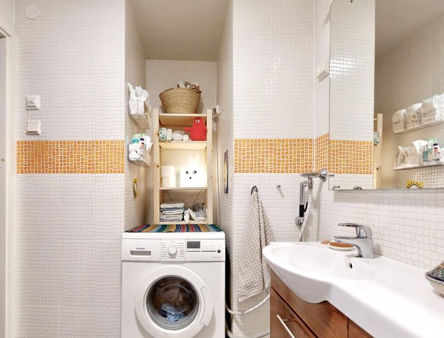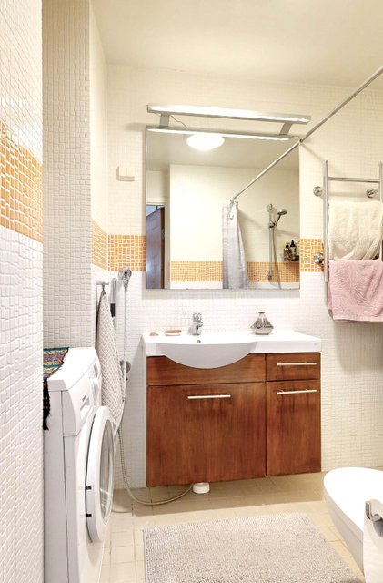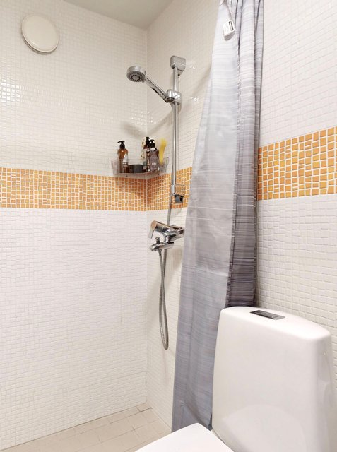 - VARUSTUS: Suihku, WC-istuin, Pesukoneliitäntä, Hana, Allas, Allaskaappi, Peili, Lattialämmitys (sähkö). Pyyhekuivain, SEINÄT: Laatta. LATTIA: Kaakeli.