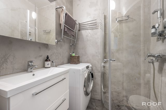 Kylpyhuone on uusittu vuoden 2016 remontin yhteydessä. Tila on käytännöllinen ja siisti, ja siellä on paikka pyykinpesukoneelle.