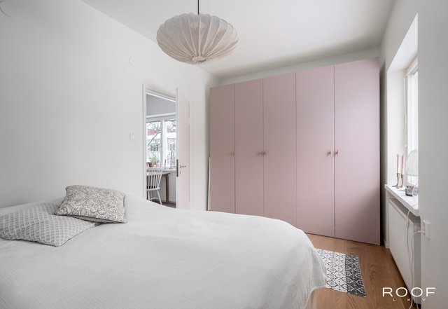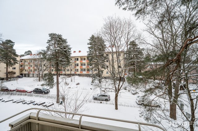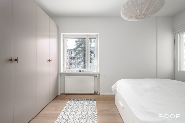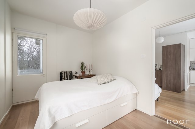Makuuhuoneessa on hyvin säilytystilaa, ja tilasta on kulku parvekkeelle. Parveke tarjoaa mukavan lisän asumiseen keväästä syksyyn ja näkymät rauhalliseen ympäristöön. Vuonna 2023 makuuhuoneen kaapiston ovet uusittiin (Doorie), mikä viimeistelee huoneen ilmeen.