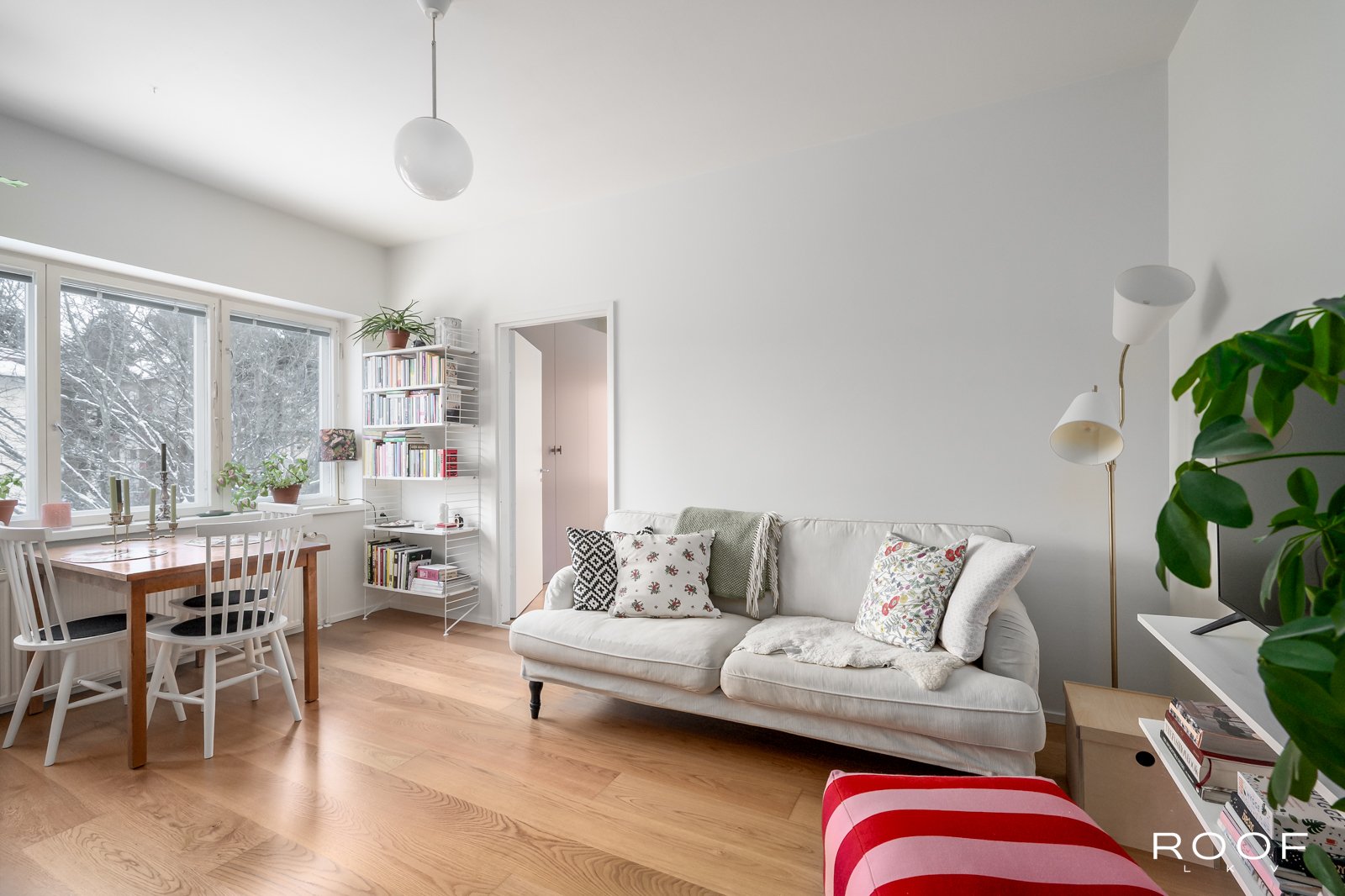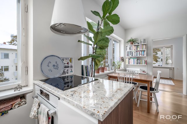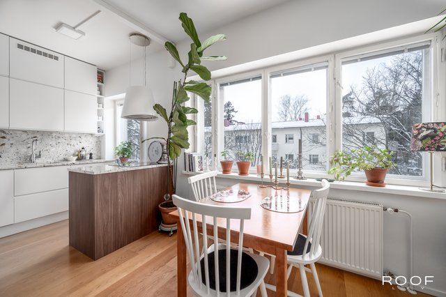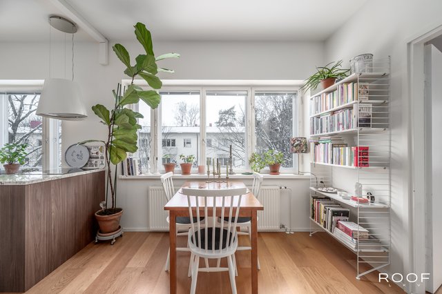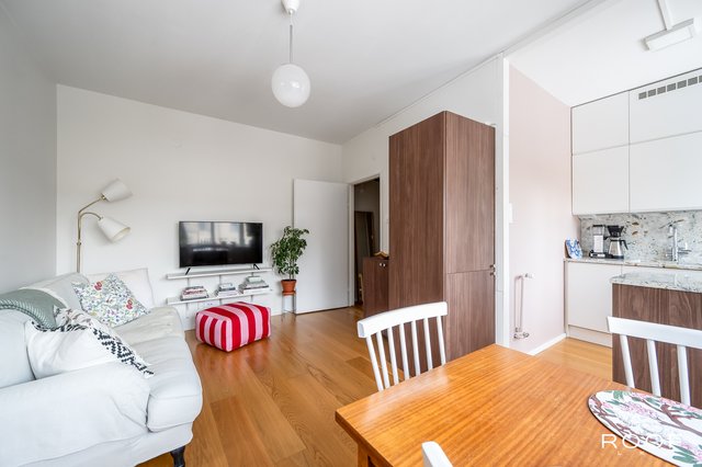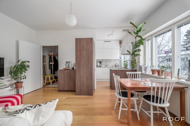 Olohuone ja keittiö muodostavat yhtenäisen kokonaisuuden, jossa on helppo sijoittaa ruokapöytä ikkunan läheisyyteen ja oleskeluryhmä omalle alueelleen. Vuoden 2016 remontissa keittiön ja olohuoneen välinen seinä purettiin, mikä avasi tilan toimivaksi ja ilmavaksi. Samassa yhteydessä uusittiin myös lattiat, ja huoneistossa on tammiparketti.