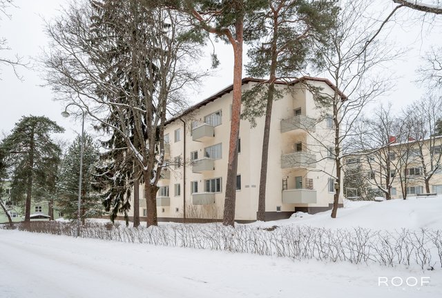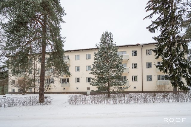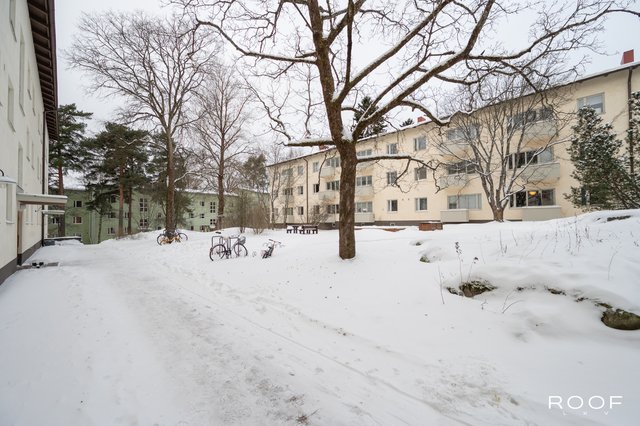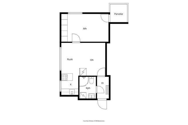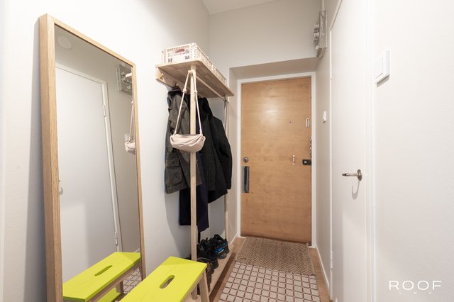 Ylimmän kerroksen (3/3, ei hissiä) koti, jossa on avara olohuone-keittiö, makuuhuone, kylpyhuone sekä parveke. Selkeä pohjaratkaisu ja isot ikkunat tuovat tilaan runsaasti luonnonvaloa.