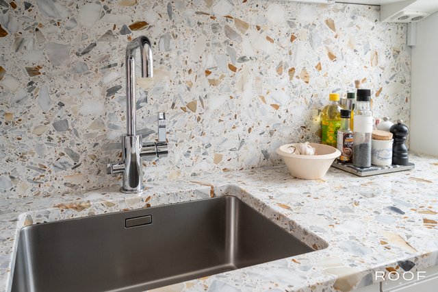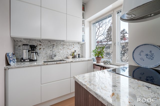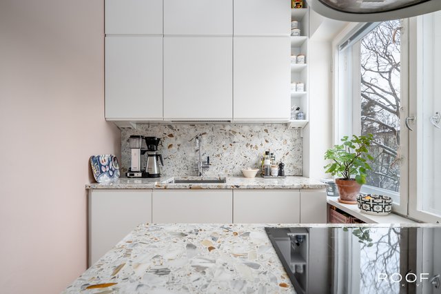 Keittiötä on päivitetty huolella myös myöhemmin. Vuonna 2023 keittiösaarekkeen ulkolevyt vaihdettiin mittatilaustyönä pähkinänsävyiseen MDF-materiaaliin (Doorie), ja sama sävy jatkuu olohuoneen puolelle integroidussa kaapistossa sekä jääkaappiratkaisussa. Keittiön taso ja välitila ovat Terrazzoa (Calacatta), ja samalla on vaihdettu myös allas (Blanco) sekä hana (Tapwell).