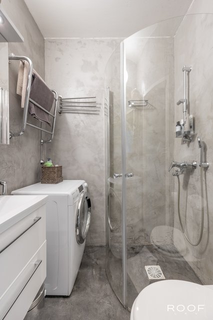 - Varustus: Suihku, Suihkuseinä, Wc istuin, Pesukoneliitäntä, Hana, Allas, Peilikaappi, Allaskaapisto Seinämateriaali: Mikrosementti Lattiamateriaali: Mikrosementti
