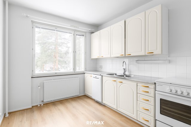 Tilavaan keittiöön mahtuu ruokapöytä ja liesi toimii kaasulla. Lasitettu parveke tuo lisätilaa ja tarjoaa näkymät pihalle.