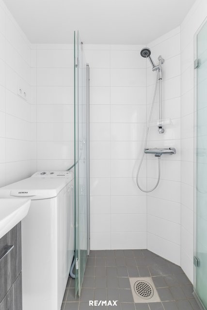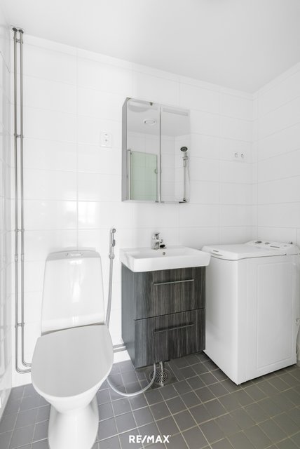 - WC-istuin, suihku, suihkuseinä, pesukoneliitäntä, peilikaappi, pesuallas, ja allaskaappi