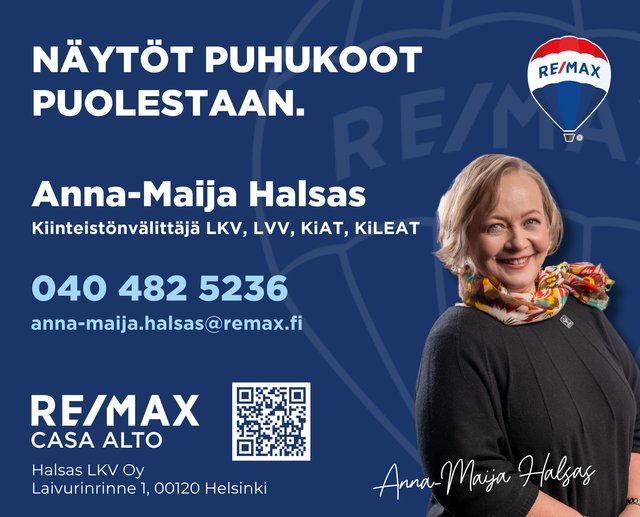 Tätä asuntoa myy Anna-Maija Halsas, Kiinteistönvälittäjä LKV, LVV, KiAT, KiLEAT / Halsas LKV Oy