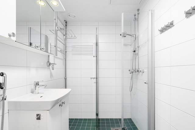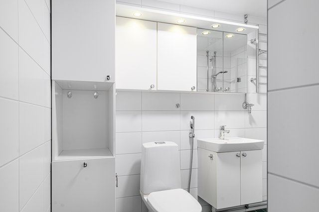 - WC-istuin, suihku, suihkukaappi, pesukoneliitäntä, lattialämmitys, peilikaappi, peili, pesuallas, allaskaappi, bidee-suihku, ja kaapistot