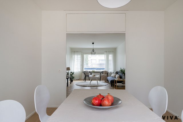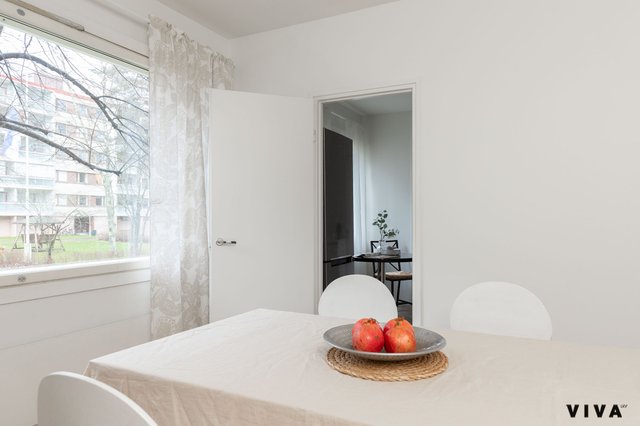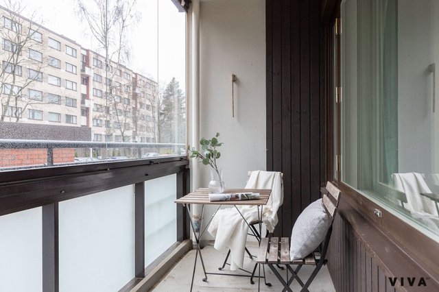 Uomakuja 6:ssa sijaitseva ensimmäisen kerroksen asunto hurmaa selkeydellään ja rauhallisella tunnelmallaan. Tilava lasitettu parveke jatkaa oleskelutilaa ja tekee asunnosta valoisan ja miellyttävän ympäri vuoden. Asunnossa on juuri valmistunut kattava pintaremontti, jossa seinät on ylitasoitettu ja maalattu, katto ja ovet on maalattu uudelleen, parketti on hiottu ja valkolakattu ja kaikki listat on uusittu. Lopputulos on raikas, moderni ja huoliteltu kokonaisuus..