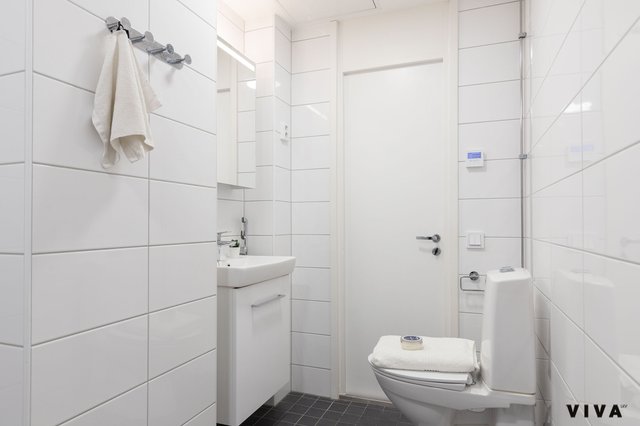 - WC-istuin, suihku, suihkuseinä, pesukoneliitäntä, lattialämmitys, peilikaappi, peili, pesuallas, bidee-suihku, ja allaskaappi