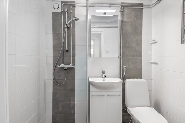 - WC-istuin, suihku, suihkuseinä, peilikaappi, lattialämmitys, pesuallas, bidee-suihku, ja allaskaappi
