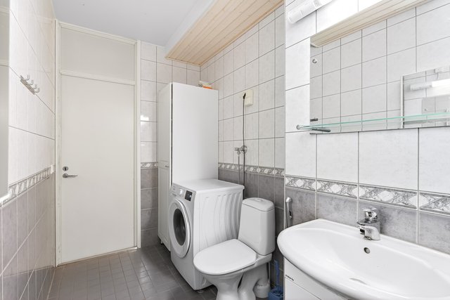 - WC-istuin, suihku, suihkuseinä, pesukoneliitäntä, peilikaappi, pesuallas, allaskaappi, bidee-suihku, ja vesikiertoinen seinäpatteri