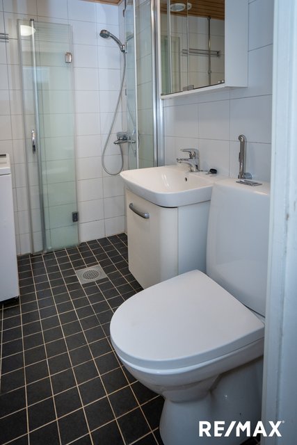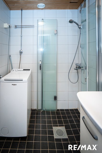 - WC-istuin, suihku, lattialämmitys, peilikaappi, pesuallas, allaskaappi, suihkuseinä, ja pesukoneliitäntä