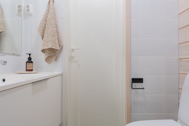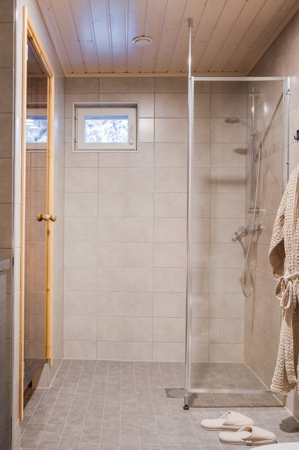 - Suihku, wc-istuin, suihkuseinä, pesukone, lattialämmitys, ja kiinteät valaisimet