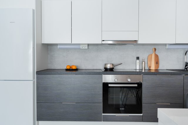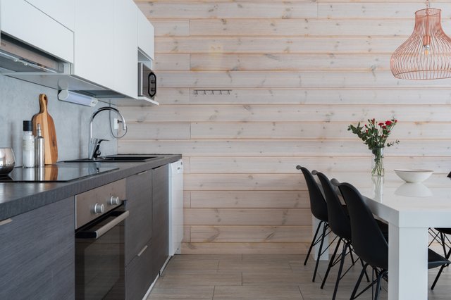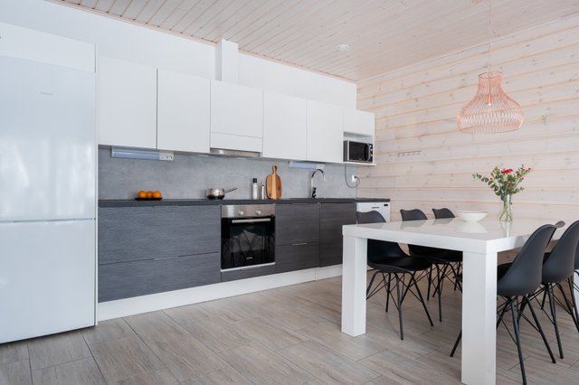 - Jääkaappipakastin, liesi, liesituuletin (hormi), astianpesukone, mikroaaltouuni, ja kiinteät valaisimet