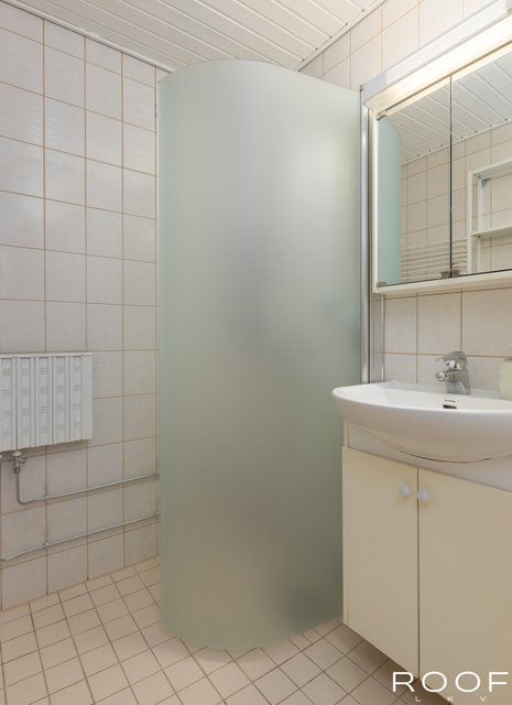 - Paikka pesutornille, suihkuseinä, allaskaapisto, peilikaappi, lattia ja seinät laatoitettu.