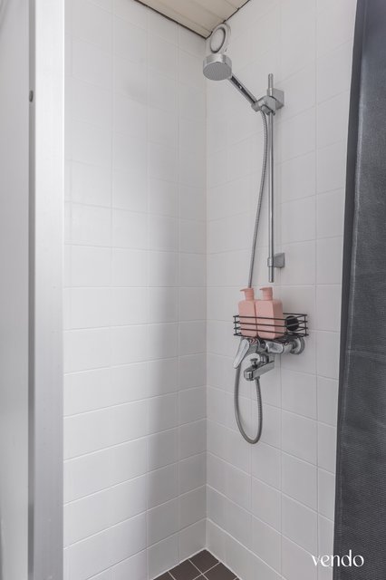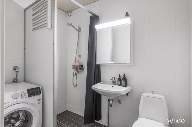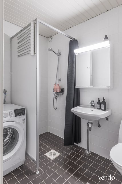 - WC-istuin, suihkuseinä, pesukoneliitäntä, peilikaappi, ja pesuallas