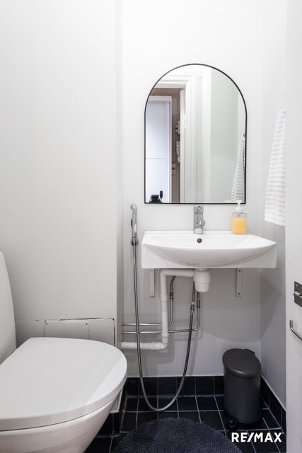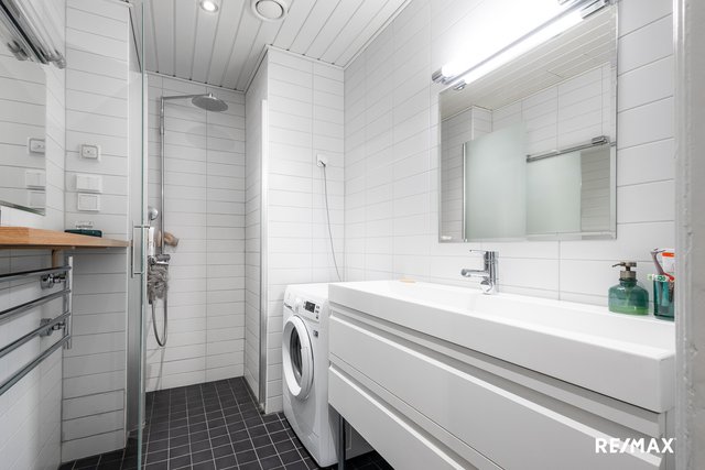 - Suihku, suihkuseinä, pesuallas, peili, pesukoneliitäntä, pyyhekuivain, lattialämmitys, ja allaskaappi